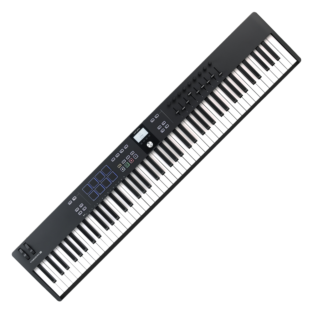 Controlador MIDI de 88 teclas semi-pesadas, con 9 faders, 9 codificadores, 8 pads RGB, pantalla LCD y perfecta integración con DAW. Ideal para producción musical en estudio.
