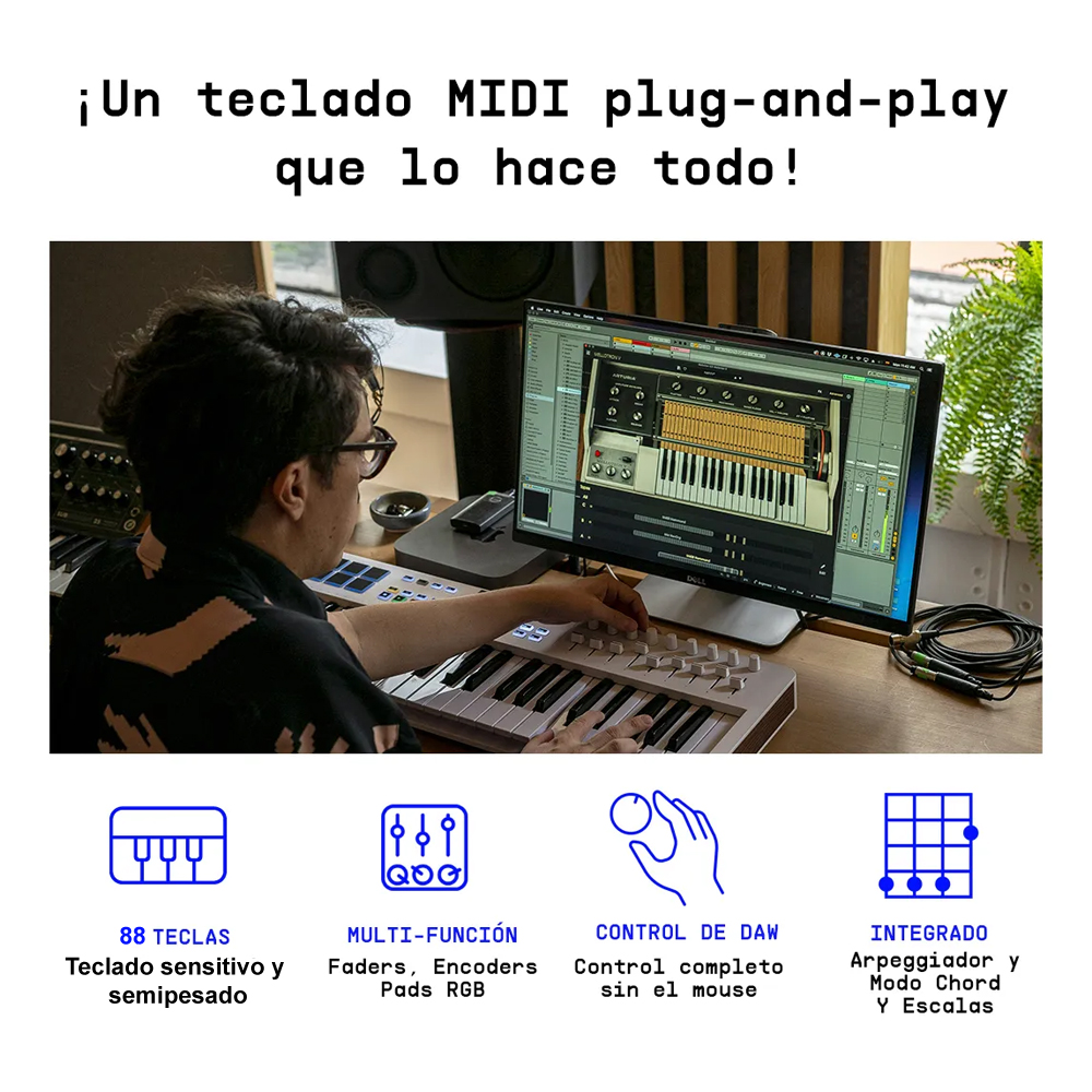 Perfecto para músicos, productores y creadores intermedios o avanzados que desean un teclado controlador de gran rango (88 teclas) con control completo del DAW, producción musical profesional y expresión instrumental.