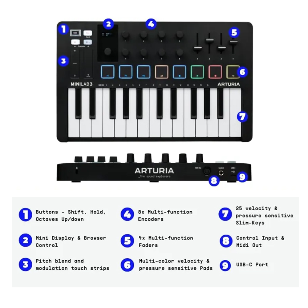 El MiniLab 3 es el nuevo controlador de Arturia que te da controles sencillos, teclas con un tacto fantástico y un paquete de software completo e integrado para expresar tu creatividad desde el primer momento. Incorpora una pantalla que te proporcionara una información visual instantánea