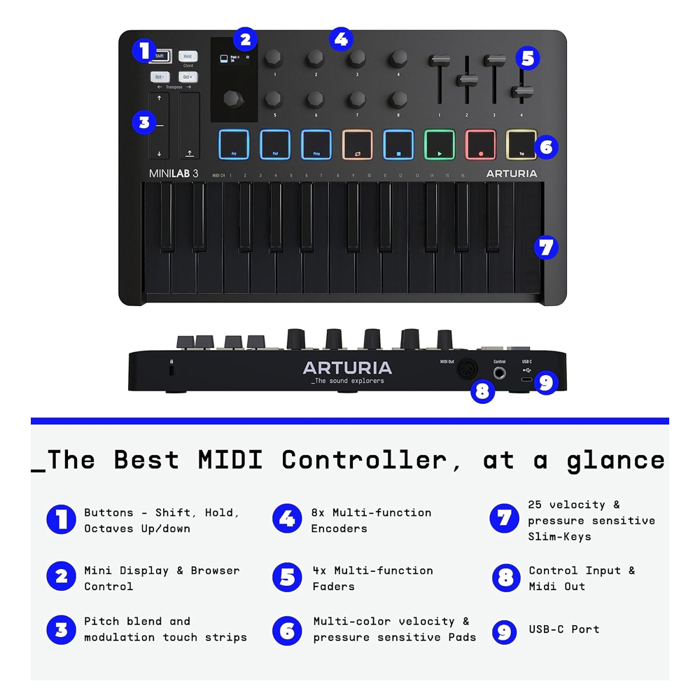 El MiniLab 3 es el nuevo controlador de Arturia que te da controles sencillos, teclas con un tacto fantástico y un paquete de software completo e integrado para expresar tu creatividad desde el primer momento. Incorpora una pantalla que te proporcionara una información visual instantánea