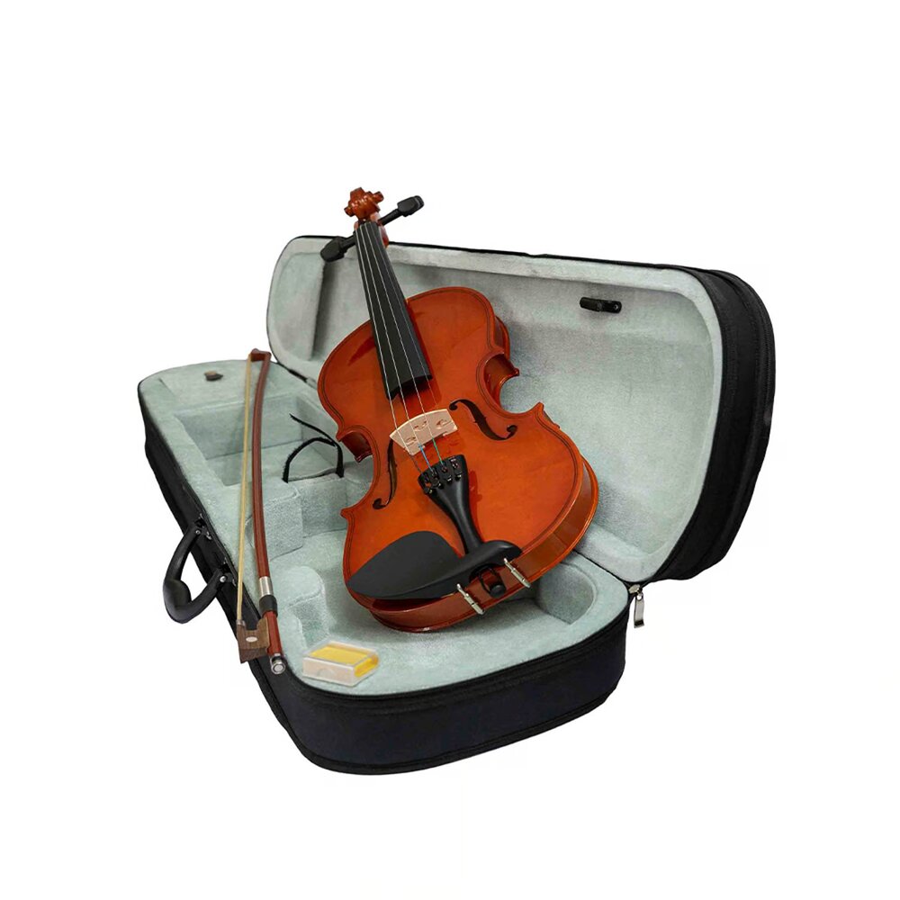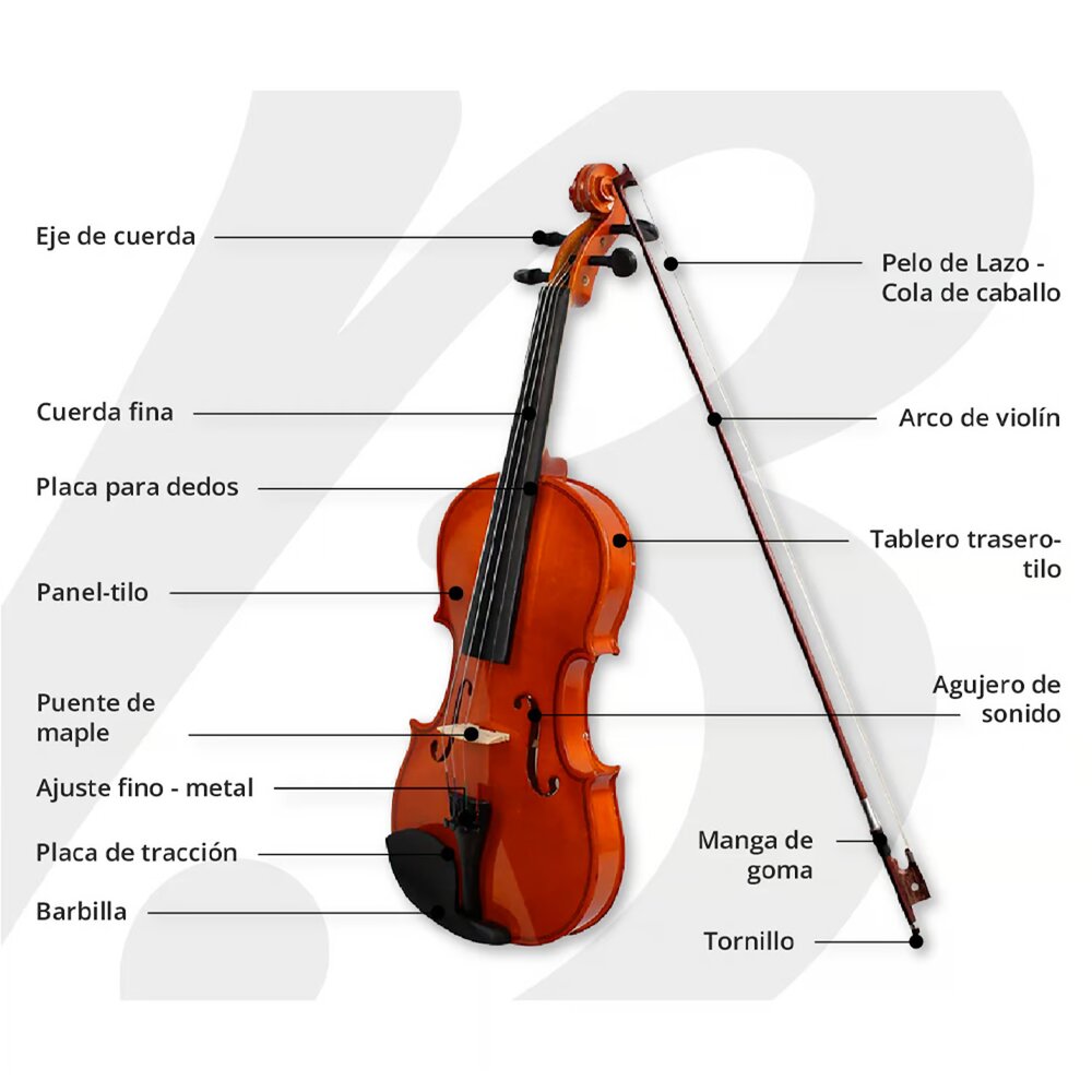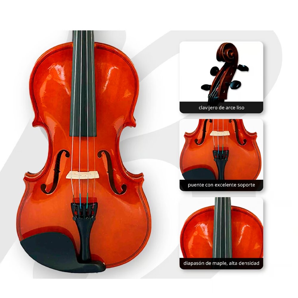 Un instrumento ideal para estudiantes y principiantes que buscan calidad y estilo en su aprendizaje musical. Fabricado con madera de linden en la tapa, aros y fondo, este violín garantiza una excelente resonancia y durabilidad. El diapasón y el puente están hechos de maple, materiales reconocidos por su resistencia y capacidad para producir un sonido cálido y claro.